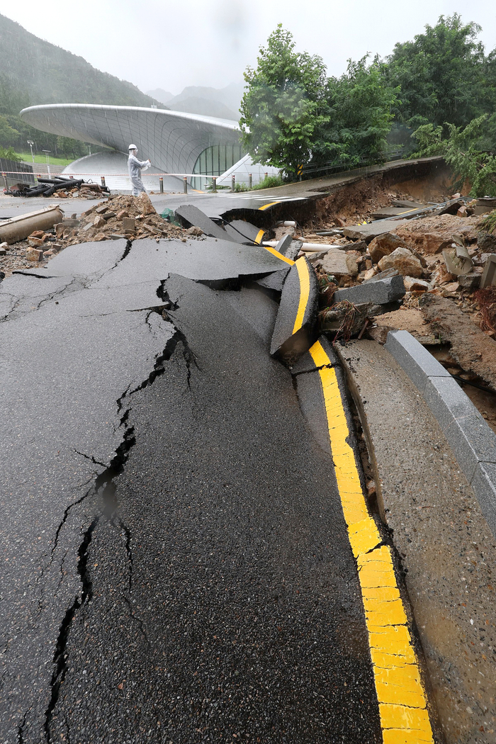当地时间2022年8月9日,韩国首尔,首尔大学冠岳校园内的道路被严重破坏。