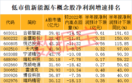 数据宝统计,截至8月9日收盘,按照半年报、快报、业绩预告净利润下限计算,A股市值低于50亿元的新能源车概念股中,上半年净利润增速40%以上的有10股,合锻智能、金鹰股份、悦达投资净利润增速翻倍。