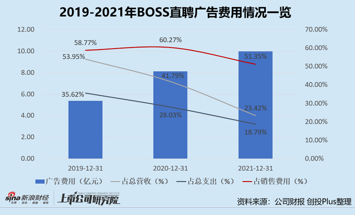 细究其费用支出不难发现,销售费用常年占据榜首。2019-2021年,BOSS直聘的销售费用分别为9.17亿元、13.48亿元和19.43亿元,其中一半以上用于广告营销。仅广告费用一项,就分别吞掉当期总营收的53.95%、41.79%和23.42%。相较之下,报告期内平台的研发费用仅占比总营收32.63%、26.39%和19.30%,远低于销售费用率。
