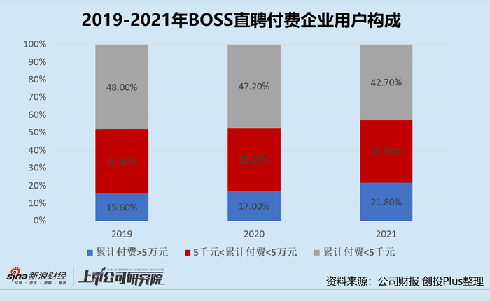 有意思的是,付费企业用户收入为BOSS直聘的总营收贡献超99%,但在用户总数不再增长的情况下,2021年全年总营收还实现了超100%的增长。