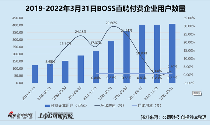 2021年第三季度和第四季度,BOSS直聘付费用户数量均为400万家。2022年第一季度平台的付费用户数量同比增长0.82%,环比小幅增长2.5%。