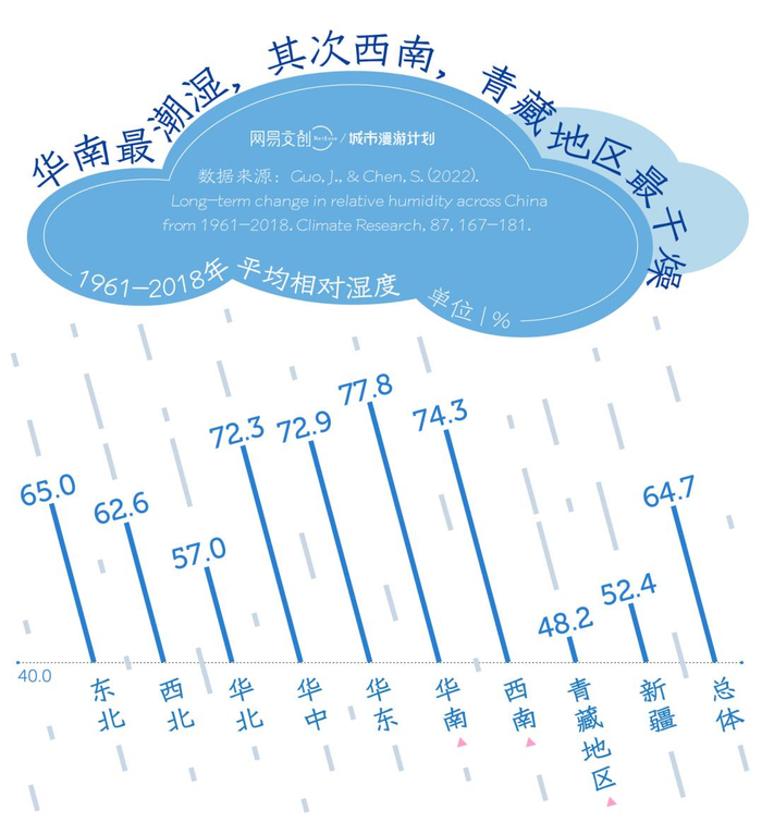 据天津气象局的研究,1961至2018年,中国年平均相对湿度为64.7%,各地区中,华南地区最高,为77.8%,其次是西南地区,最低的则是青藏、新疆与华北地区[21]。