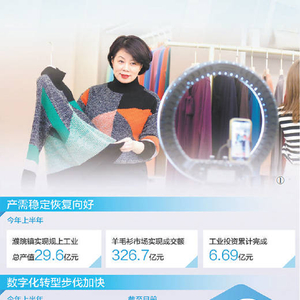 数据显示,尽管受疫情影响,今年上半年,濮院镇实现规上工业总产值29.6亿元。市场持续回暖,上半年羊毛衫市场实现成交额326.7亿元,电子商务交易额突破156.9亿元,占比近50%。投资不断攀升,全镇完成固定资产投资25.2亿元,同比增长18.7%,完成年度目标的51.4%。