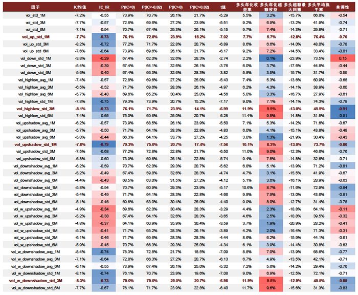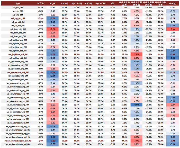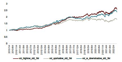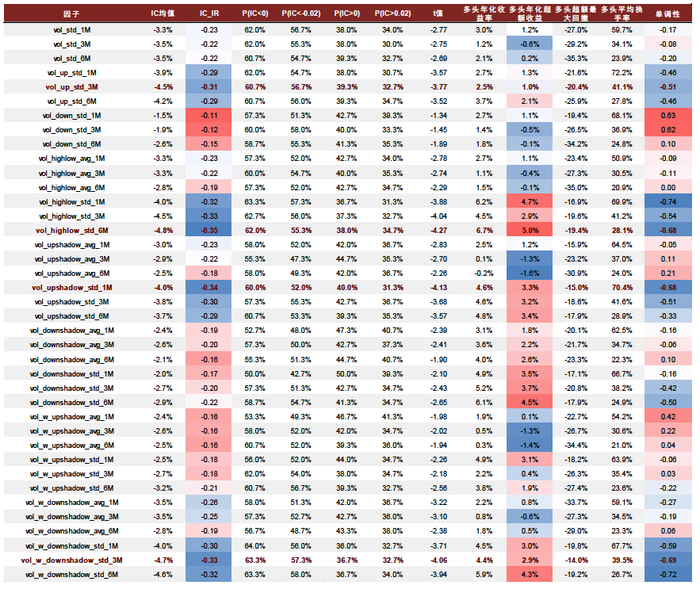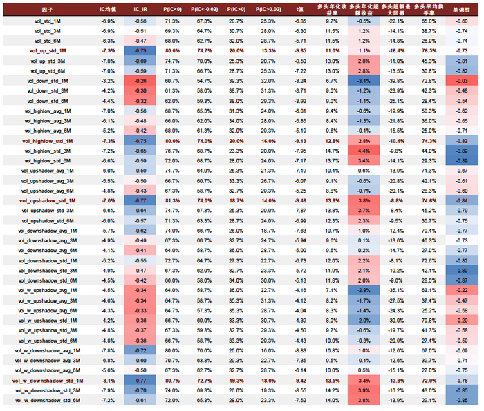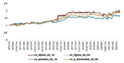 综上所述,我们相对推荐振幅的标准差因子,如vol_highlow_std、vol_upshadow_std和vol_w_downshadow_std等。同时,对比不同周期的振幅标准差因子的IC均值和多头组合收益表现,我们发现其选股能力未有显著差异,但长周期(6个月)的波动率因子多头组合换手率明显低于短周期(1个月)的波动率因子。考虑换手成本的情况下,长周期的振幅标准差因子性价比更高。