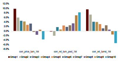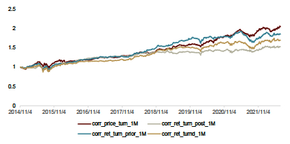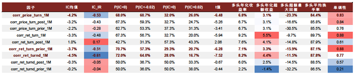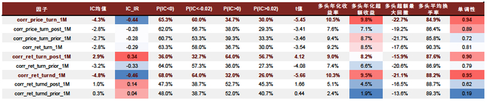 量能领先阶段往往是信息扩散的初期,量能领先因子(corr_ret_turn_post_1M)与未来收益正相关,全市场IC_IR为0.52,在沪深300、中证1000范围内亦有不俗的表现;量价同步阶段往往是信息扩散的中后期,量价同步因子(corr_ret_turnd_1M、corr_price_turn_1M)与未来收益负相关,全市场IC_IR可达-1.00,总体表现较好,在不同选股范围内均具有较强的选股能力。