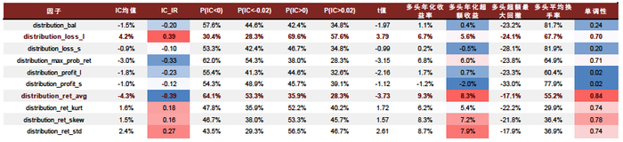 筹码分布旨在刻画股票持有人的持仓成本分布情况,我们据此构建了筹码分布的均值、标准差、偏度、峰度等因子,以及不同盈亏水平的筹码占比因子。该类因子在沪深300和中证500范围内因子IC表现较弱,在全市场、中证1000范围内才具有一定的选股效果,IC_IR的绝对值大概可以达到0.40左右。
