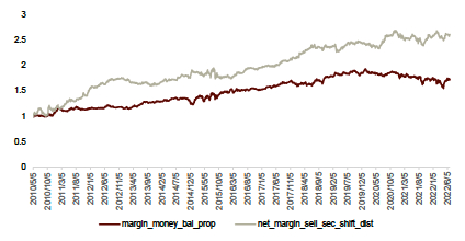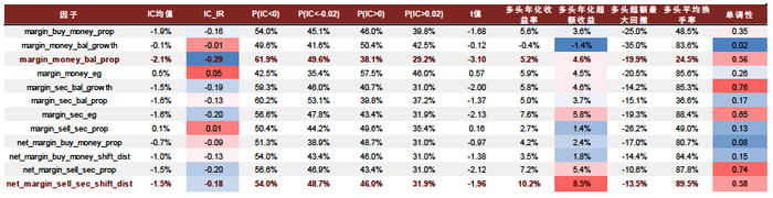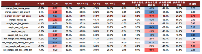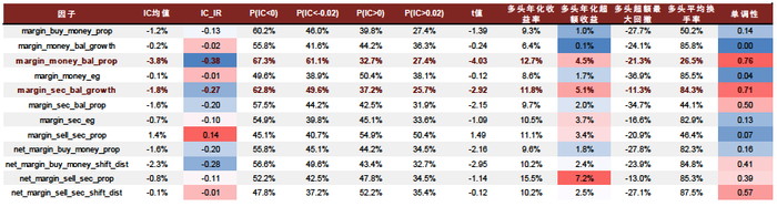 ►融资因子包括所有与融资相关的6个因子。相较于其他融资融券因子而言,margin_money_bal_prop因子在全选股域的单调性较好,且有着平衡的有效性和预测能力表现。其余融资因子的单调性较差,且在全市场范围中收益预测能力不佳。全市场中,margin_money_bal_prop因子的IC均值为-2.7%,IC_IR为-0.37。