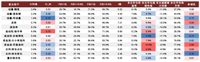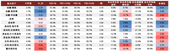 我们取前文分析的各类因子中,选股效果较好的因子,按同类型因子等权合成的方式,构建了12个复合因子。复合因子的具体构建方式如下表所示,复合因子合成过程中,我们对因子的方向进行了调整,使各个复合因子均与下期收益率正相关。