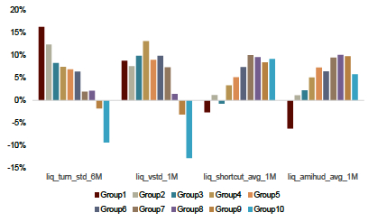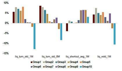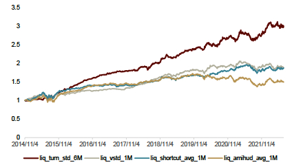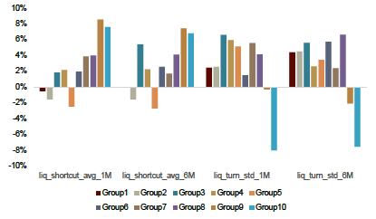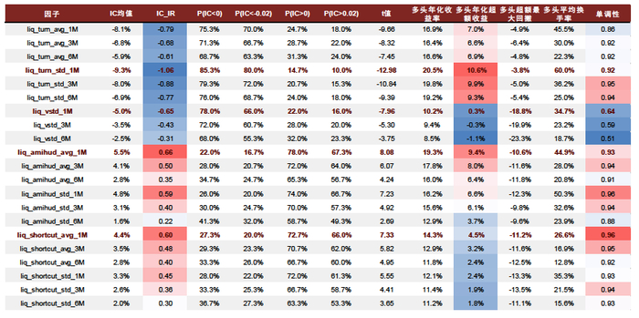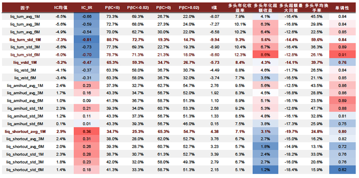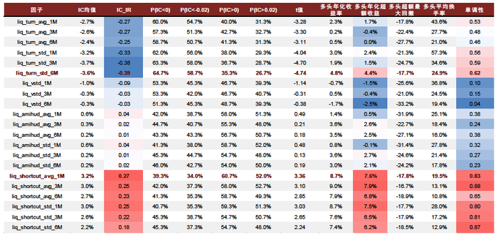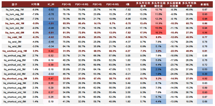换手率因子与价格弹性因子均值得关注,其中,换手率标准差因子(liq_turn_std_6M)在沪深300、中证500、中证1000范围内的IC_IR分别为-0.39、-0.70、-0.81,表现均较好。同时,虽然价格弹性因子(liq_vstd_1M、liq_shortcut_avg_1M)有效性不如换手率因子,但考虑到其与换手率因子仅有弱相关关系,构建流动性的大类因子时,价格弹性类因子亦值得考虑。
