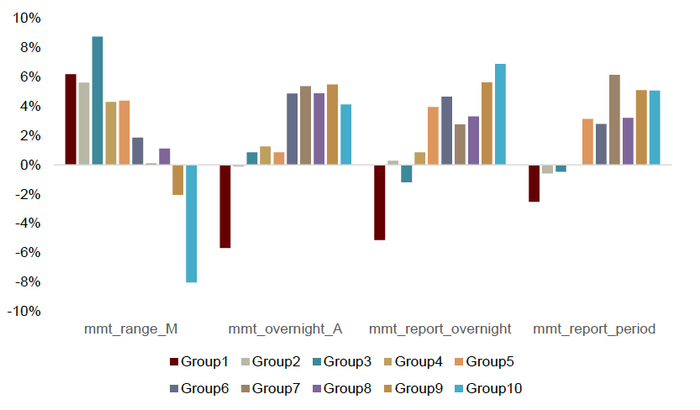 中证500范围内,mmt_range_M、mmt_report_overnight因子分组表现较好,但多头组合2021年9月以来均有所回撤。两个因子均多头组合显著跑赢基准,空头组合显著跑输基准,且单调性较为良好;mmt_report_overnight因子的多空头表现均较为良好,而mmt_range_M因子的有效性更多来源于空头。