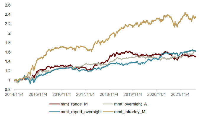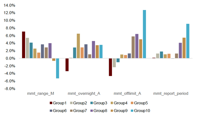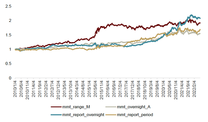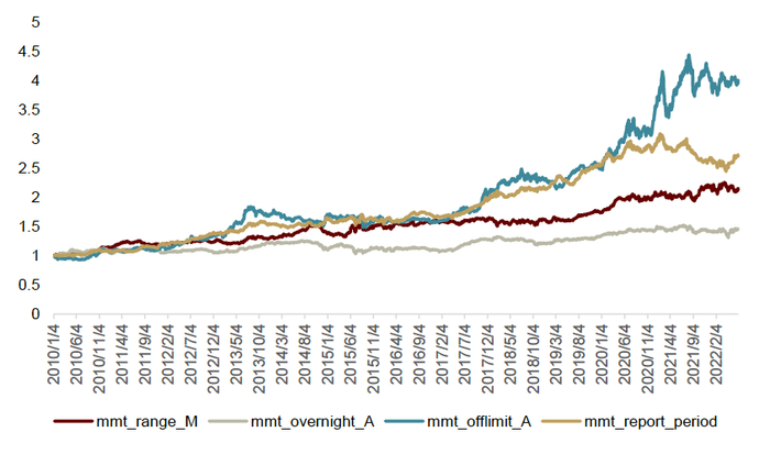 沪深300范围内,mmt_range_M、mmt_offlimit_A因子分组表现较好。如下图所示,mmt_range_M、mmt_offlimit_A因子多头组合显著跑赢基准,空头组合显著跑输基准,分组单调性也相对较好,具有较强的选股能力;mmt_report_period则多头表现相对较好,但2020年下半年以来多头组合相对净值有所回撤;mmt_overnight_A因子的有效性则更多来源于空头组合。