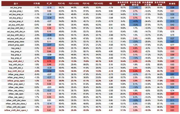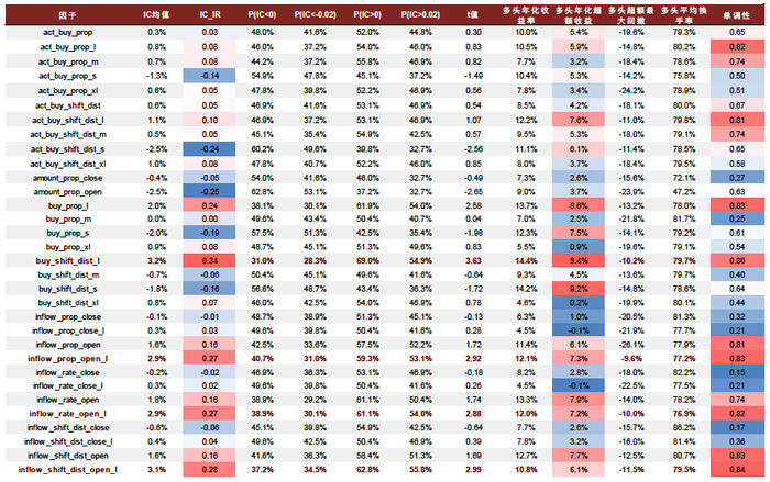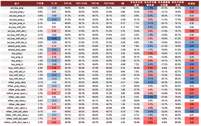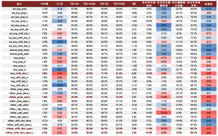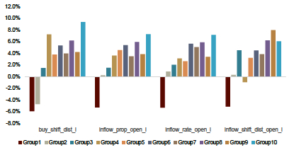 资金流因子反映了不同类型资金流向的信息,该类因子的核心思路是捕捉“聪明资金”的流向,采取跟随策略,以期获得基本面改善带来的超额收益。从因子有效性角度来看,大单买入因子(buy_shift_dist_l)具有正向预测能力,全市场IC_IR达0.78;小单主动买入因子(act_buy_shift_dist_s)具有负向的预测效果,全市场IC_IR为-0.46。这一结果与直观理解相近,大单更多表征较为理性的机构观点,而小单则主要代表相对非理性的观点。此外,开盘资金流入因子(inflow_shift_dist_open_l)在沪深300、中证500、中证1000范围内也具有较强的选股效果,多头组合年化超额收益分别为6.1%、8.6%、8.8%,分组单调性也较好,亦值得关注。