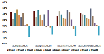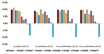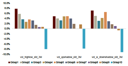 ►振幅因子考虑了最低价到最高价的振幅、上影线、下影线、威廉上影线、威廉下影线的均值和标准差。总体来看,振幅、影线标准差因子的有效性略好于均值因子,其中,vol_highlow_std、vol_upshadow_std和vol_w_downshadow_std因子在不同范围内表现均较为突出,有效性与单调性良好,多头选股组合表现优于收益波动率因子;中小市值范围内(中证500、中证1000)的有效性显著优于大市值范围(沪深300)。
