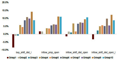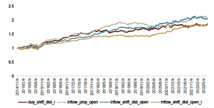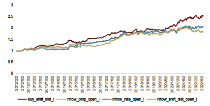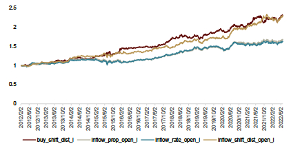 中证500范围内,buy_shift_dist_l和inflow_shift_dist_open_l因子的多头组合显著跑赢基准,具有较好的选股能力。而inflow_prop_open_l和inflow_rate_open_l因子则分组收益的单调性相对较差。