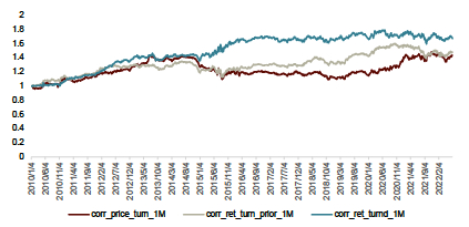 ►中小市值范围内则推荐关注换手率因子、反转因子。中证1000范围内,换手率因子、反转因子的IC_IR分别为0.81、0.78,IC均值分别为8.0%、6.9%,多头组合年化超额收益亦有较好的表现。资金流因子虽然IC_IR表现在价量因子中表现不算突出,但考虑到它与动量、波动率、流动性因子相关性均较低,仍可作为有效的增量信息加入多因子模型中使用。