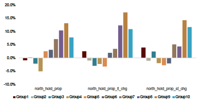 ►持仓占比因子包括仅涉及静态比例的4个因子。north_hold_prop因子在全选股域都表现较为突出,有效性和单调性优良,同时有不俗的选股能力;north_hold_prefer因子在全市场、中证500和中证1000中也表现较好,虽然预测收益能力略逊north_hold_prop因子,但是其有效性、单调性和预测能力均优于其他静态占比因子。全市场中,north_hold_prop因子的IC均值为3.5%,IC_IR为0.60;north_hold_prefer因子的IC均值为3.8%,IC_IR为0.69。