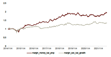 margin_money_bal_prop和margin_sec_bal_growth因子在中证500和中证1000中相较而言表现尚可。我们基于相关性统计,大致将融资融券因子分为以下两类:融资因子和融券因子。
