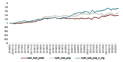 north_hold_prop和north_hold_prefer_lt_chg因子在全市场范围内表现较为优异。我们基于相关性统计,大致将北向资金流因子分为以下两类:持仓占比和持仓变化因子。
