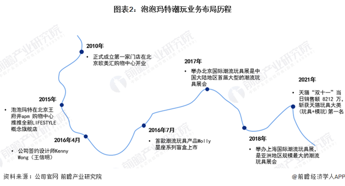 泡泡玛特拥成立于2010年,总部位于北京,业务包括零售店、商品研发、IP授权、APP开发及大型潮玩展会的主办等。公司于2010年在北京欧美汇购物中心开设第一家门店,随后于2015年在北京王府井apm 购物中心推推全新LIFESTYLE概念旗舰店。2016年,公司与Kenny Wong(王信明)展开合作,Molly公仔大火,潮玩市场被发掘,盲盒、公仔和收藏玩具等概念逐渐进入消费者的视野,并被年轻一代消费群体追逐热议。