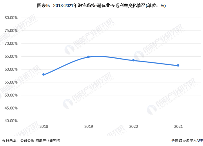 从泡泡玛特潮玩业务毛利看,2018-2021年毛利率先上升后下降,整体在55%-65%区间内波动。2021年泡泡玛特毛利率超过60%,同比下降约2个百分点。