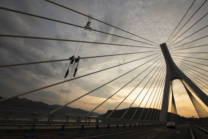8月10日清晨,四川省阆中市工人在盘龙山嘉陵江大桥拉索上安装灯饰。连日来,当地持续高温,户外施工抓住早晚凉爽时段进行作业。