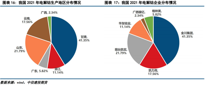 我国电解钴产能处于缓慢爬升的趋势。由2017年的1.185万吨增长至2021年的2.51万吨,其产能增量主要来源于浙江、广东及甘肃等地区。
