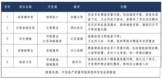 近期,包括安徽合肥招商雍和府、湖北武汉正商金域世家、江苏南通时光漫城、四川成都首钢蓉璟台、重庆市桂语九里等项目业主反映精装修房屋交付后存在漏水、墙面空鼓开裂、壁纸返潮、价格与整体装修工艺不相符等多个问题,开发商及物业或拖延整改,或整改不到位,影响业主入住。