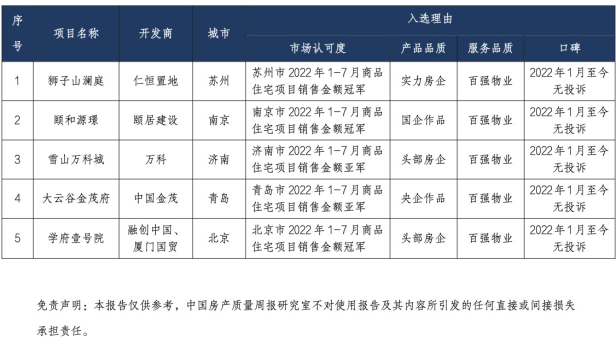 上周,中国房产质量周报舆情研究室基于市场认可度、产品品质、服务品质及口碑四个维度,甄选出本期明星楼盘,包括苏州市狮子山澜庭、南京市颐和源璟、济南市雪山万科城、青岛市大云谷金茂府和北京市学府壹号院。