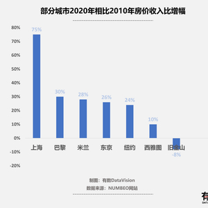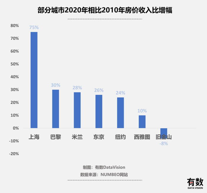 对比近十年全球各大城市的房价收入比增幅,上海的增幅高达75%,一骑绝尘。