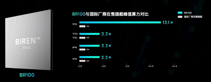 根据发布会上的数据,壁仞科技BR100对比英伟达在售的7nm制程旗舰GPU“A100”,在Int8、BF16、TF32/TF32+、FP32数据格式下至少有3.3倍的峰值性能优势,在FP32数据格式下性能优势更是达到13.1倍。