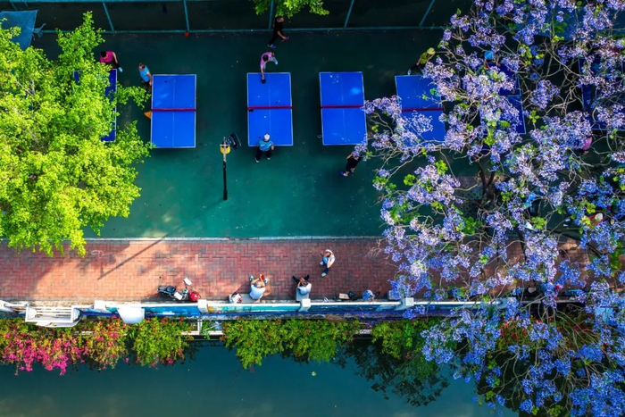 公园一年四季繁花满地,清澈的湖水,养眼的景观植被,宽阔的场地,是许多爱运动的市民的运动胜地。