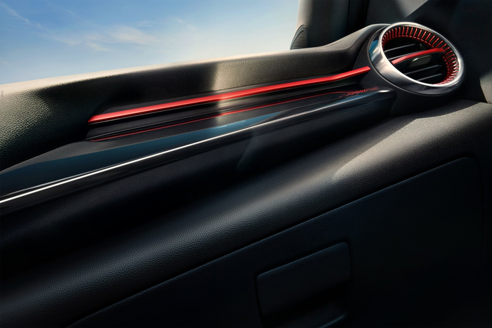 亚克力水晶质感造型设计的排挡杆搭配RS车型专属的耀红徽标,进一步提升了车内的运动氛围。排挡杆旁边的两个杯架之间还特意设计了一个手机槽,方便驾驶者放置手机。