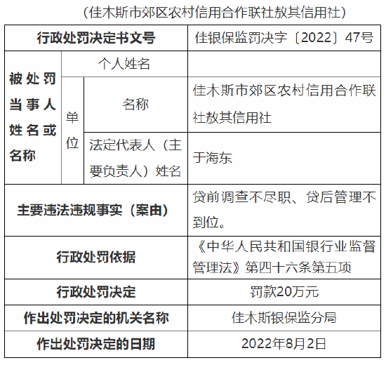 因贷前调查不尽职、贷后管理不到位 佳木斯郊区农信社及其两分社遭监管处罚