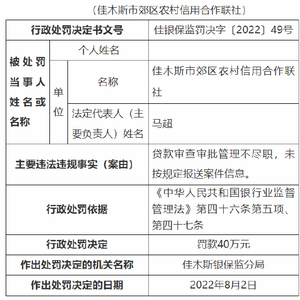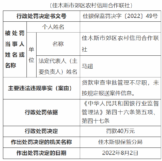 其中,佳木斯市郊区农村信用合作联社被罚款40万元;佳木斯市郊区农村信用合作联社敖其信用社、长发信用社分别被监管罚款20万元。