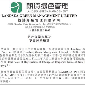 同时,公司于联交所买卖股份的英文简称由“LANDSEAPPT”更改为“LANDSEAMGMT”,中文股份简称由“朗诗地产”更改为“朗诗绿色管理”,自8月15日上午9时生效,股份代码“106”维持不变。