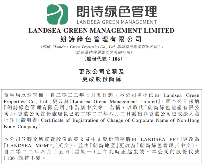 8月9日晚间,朗诗地产 (HK00106,股价0.171港元,市值8.08亿港元 ) 发布公告,自2022年7月5日起,公司名称已由“Landsea Green Properties Co.,Ltd”更改为“Landsea Green Management Limited”,公司采纳“朗诗绿色管理有限公司”作为新中文第二名称,以取代“朗诗绿色地产有限公司”。