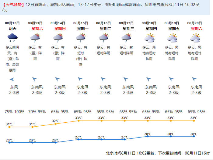 据深圳市气象台2022年8月11日10:00发布信息,12日深圳有阵雨,局部可达暴雨;13-17日多云,有短时阵雨或雷阵雨。