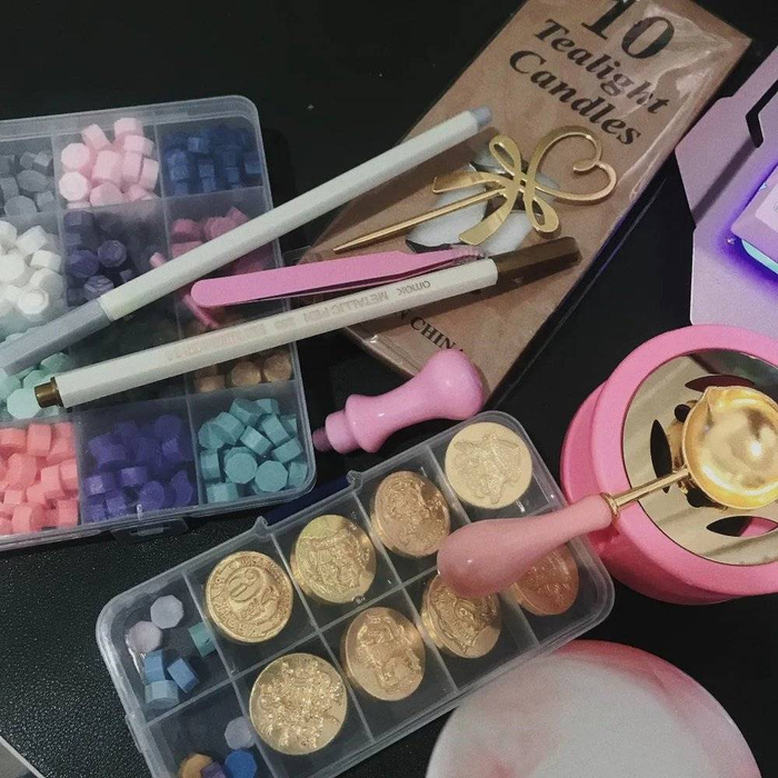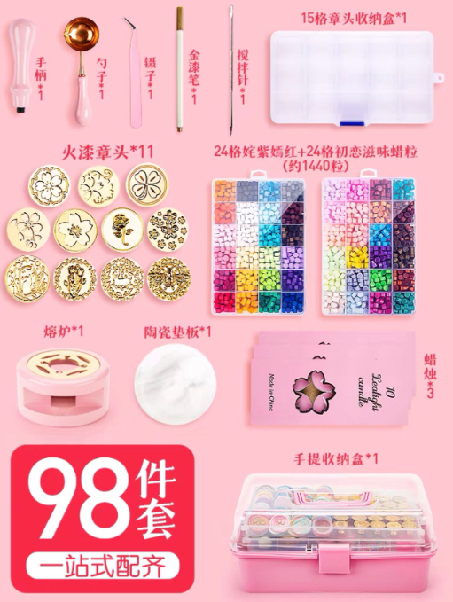 以上套装仅适用于像我这样的新手,更高阶的玩家,则会在蜡的选择上投入更多的金钱与精力,因而也会有更多更复杂的火漆工具与材料,如胶枪、油画棒、闪粉、热熔胶棒、大豆蜡等;当然也可以选择购买其他人调好的蜡粒,价格大概是150元到500元一斤不等。