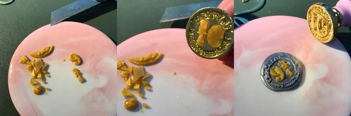 人一骄傲,就容易膨胀,我又产生了一些自己动手套色的念头,说干就干,于是又一个失败的火漆币诞生了。