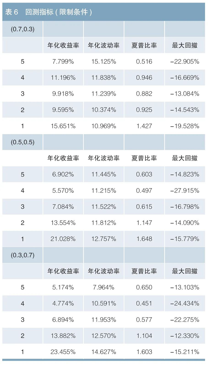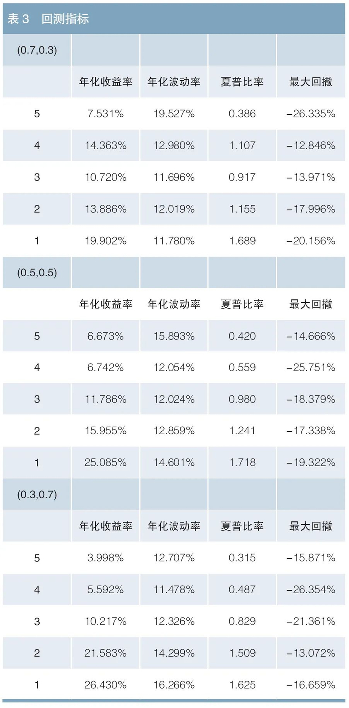 表3展现了权重分别为(0.7,0.3)、(0.5,0.5)和(0.3,0.7)的5组投资组合的净值曲线以及其在回测区间内的年化收益、年化波动率、夏普比率和最大回撤等指标。这三个权重分别代表了偏债组合、均衡组合以及偏股组合。