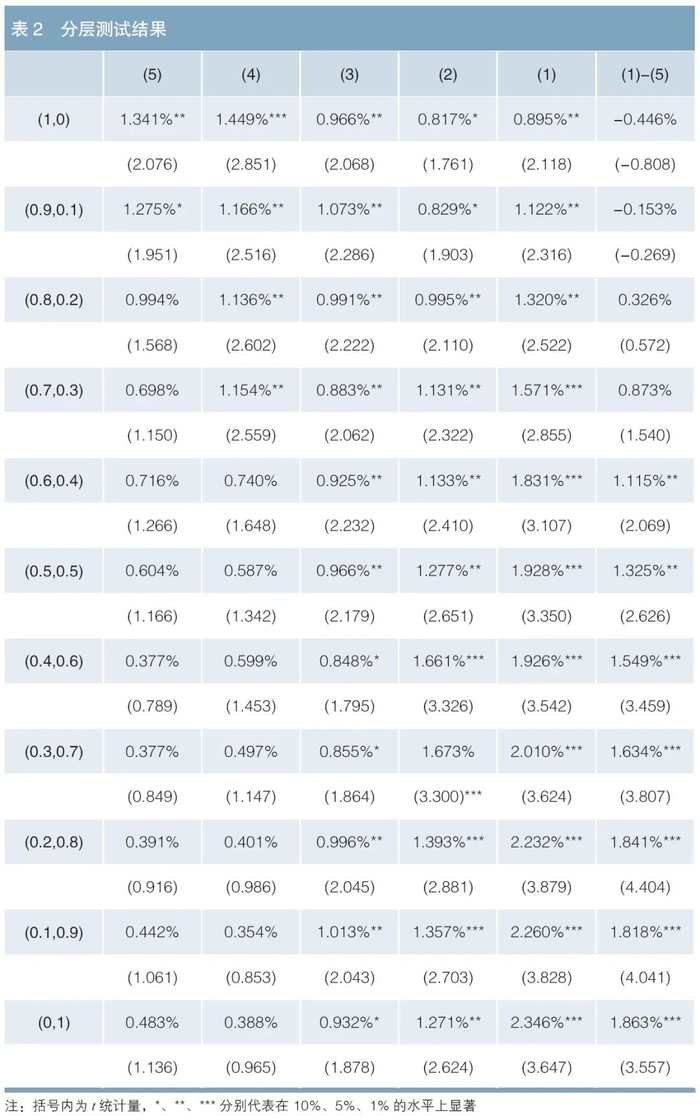 研究结果的第一列显示为收盘价以及转股溢价率对应的权重,即(close_price_weight, conversion_premium_weight),之后的每列显示的是5组分层测试中,每组的平均月收益率以及其月收益率序列的t统计量大小。最后一列显示的是低估值组-高估值组的平均月收益率及其t统计量大小(见表2)。