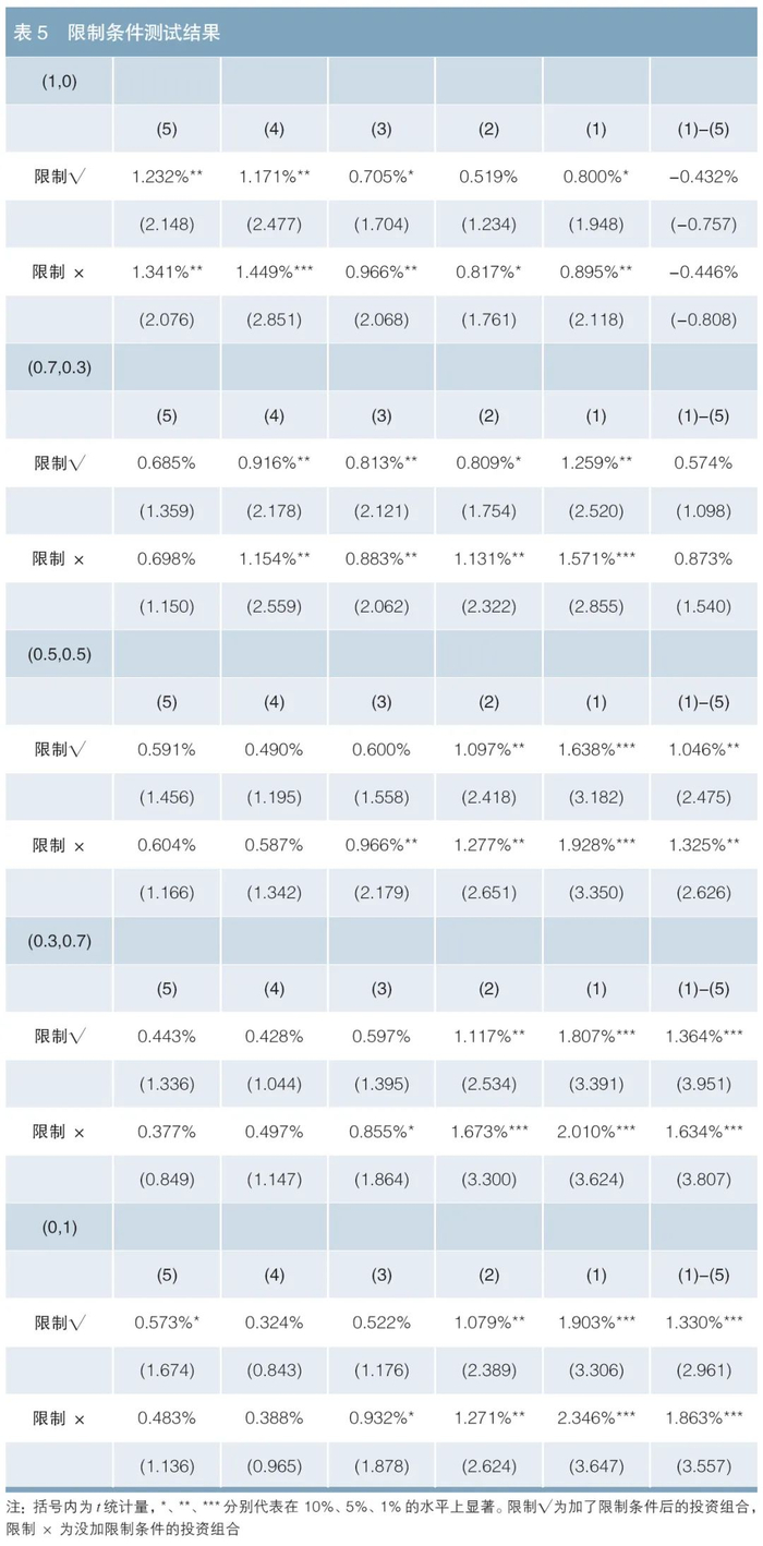 表5说明,在保持调仓频率为月频及满足相关方面限制条件后,组合的收益结果普遍比未加限制条件的收益率低。对于低价组减去高价组的收益率,加入限制条件之后超额收益普遍受限。这说明对于较为稳健的可转债投资标的,名义价格幻觉现象会有所减弱。