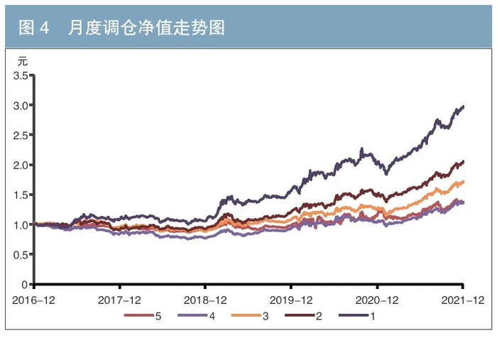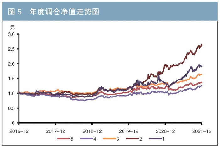 图4至图5展示了不同调仓的5个投资组合的净值走势图。可以看出,当把调仓频率降低时,因为无法实时追踪市场最新变化,双低带来的收益差异会缩小,但是其整体趋势仍然不变。估值越低的投资组合收益越好,并且调仓频率越低的投资组合收益越高。