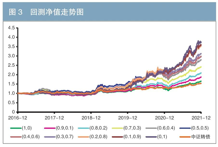 图3的净值走势图选取了11个权重的低价组合和中证转债在近5年的表现。可以看到,转股溢价率所占权重越高的组合,其收益越好,并且所有组合的收益均高过了中证转债的收益。这说明在市场整体走势较好的大背景下,低估值可转债的贡献更加明显,其涨幅也远高于高估值的可转债。