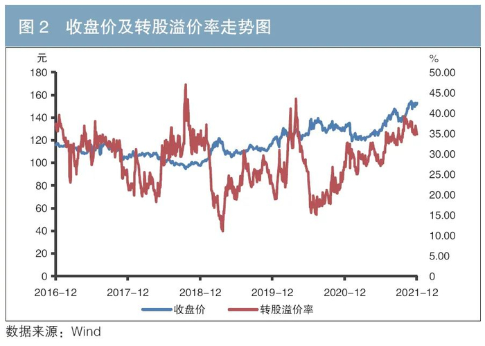 图2是近五年来我国可转债的收盘价(当日可交易转债的平均收盘价)和转股溢价率(当日可交易转债的平均转股溢价率)的走势图。可以看出,整体的转股溢价率一直处于波动状态,并无持续上升或下降的趋势。