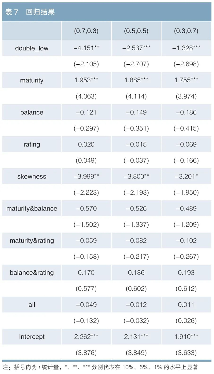 从表7结果可以看出,三种权重构建的双低指数都对可转债的收益有显著的影响。其中按照偏债组合权重构建的双低指数在5%的水平下显著,另外两个组合在1%的水平下显著,并且三种权重均说明,双低指数越高可转债收益率越低,这也证明我国可转债市场的名义价格幻觉现象。