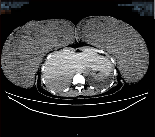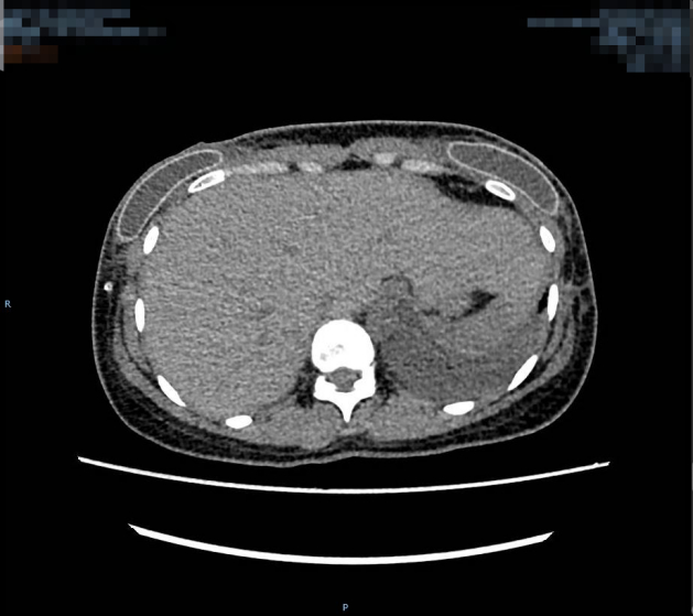 该患者胸部增强CT术前(左图)术后(右图)对比图,其中术前大小约:267mm×100mm×293mm(左),125mm×270mm×340mm(右)