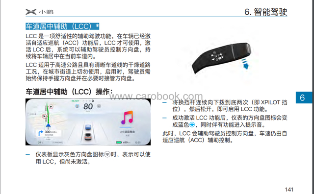 根据小鹏汽车官网介绍LCC(车道居中辅助)是一项舒适性的辅助驾驶功能,包含60km/h以下的TJA(交通拥堵辅助)和60km/h以上的ICA(智能巡航辅助)。 激活LCC后,系统可以辅助驾驶员控制方向盘,持续将车辆居中在当前车道内。
