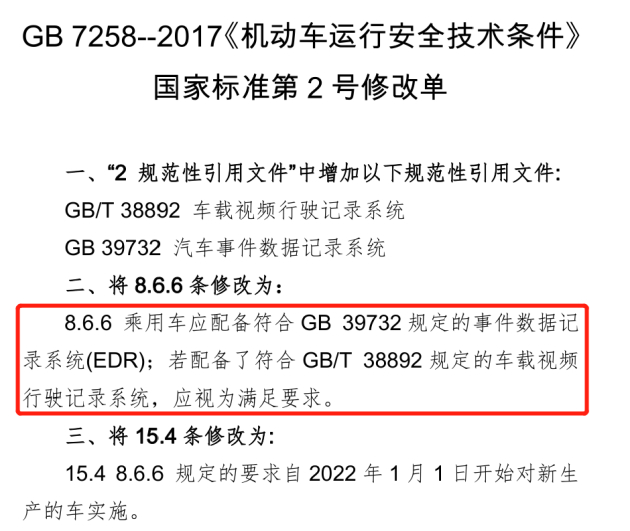 根据工信部新修改的《机动车运行安全技术条件》,今年1月1日起,新生产的乘用车应配备符合 GB 39732 规定的事件数据记录系统(EDR)或配备符合 GB/T 38892 规定的车载视频行驶记录系统。