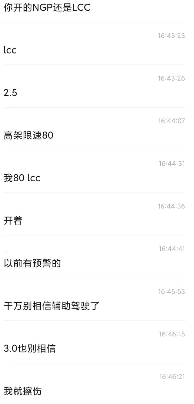 一段疑似车主发生的聊天记录显示,车主在行驶过程中开启LCC(车道居中辅助)功能,时速为限速要求的80km/h,辅助驾驶功能没有识别到前方障碍,没有预警,在碰撞发生前,车主“刚好分神”。